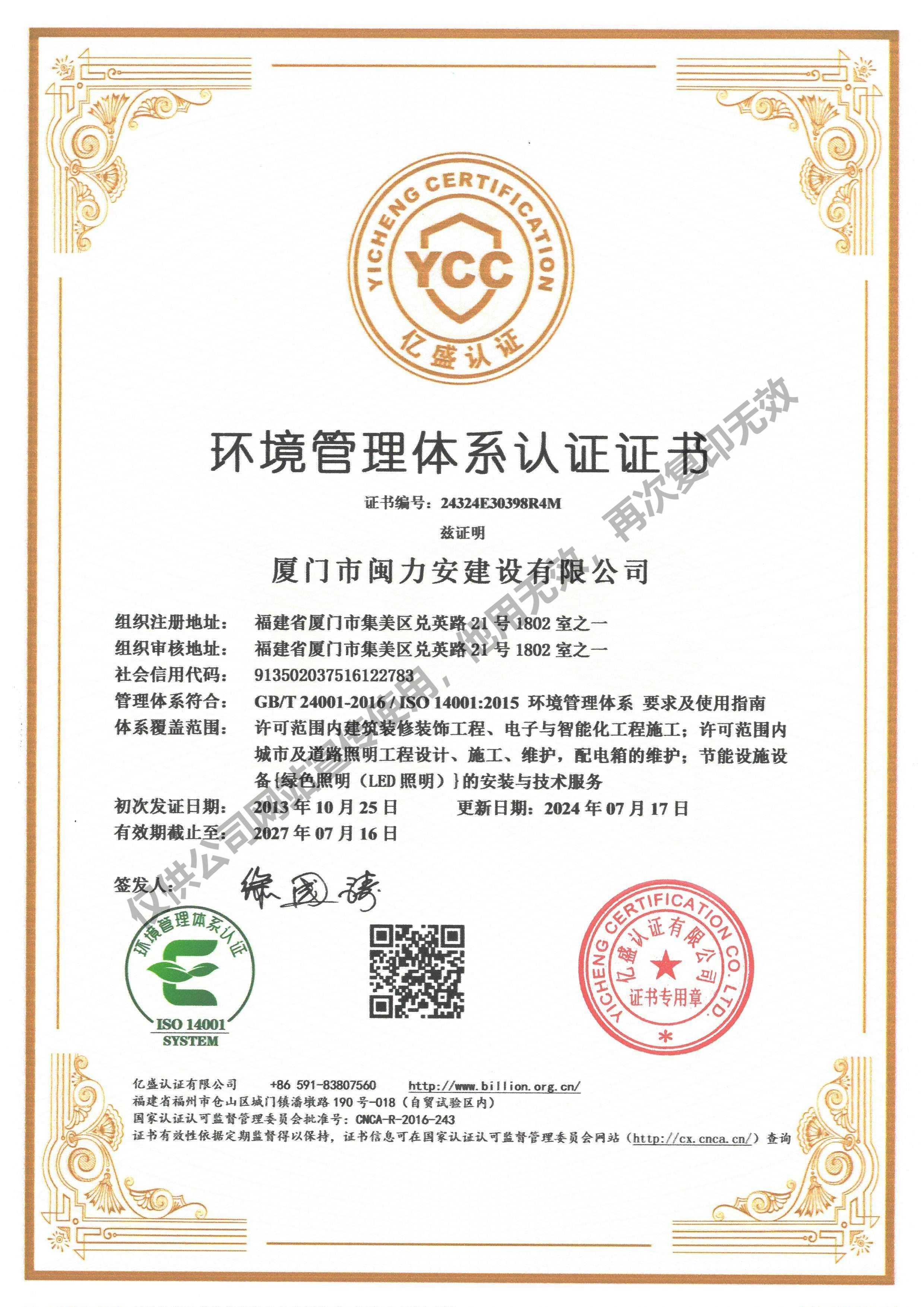 廈門市閩力安建設(shè)有限公司成立于2003年,公司取得市政公用工程施工總承包貳級、建筑裝修裝飾工程專業(yè)承包壹級、城市及道路照明工程專業(yè)承包壹級、電子與智能化工程專業(yè)承包貳級、消防設(shè)施工程專業(yè)承包貳級、電力工程施工總承包叁級、建筑機電安裝工程專業(yè)承包叁級、輸變電工程專業(yè)承包叁級、環(huán)保工程專業(yè)承包叁級、照明工程設(shè)計專項甲級、建筑裝飾工程設(shè)計乙級、施工勞務(wù)等資質(zhì)的綜合型企業(yè),公司于2013年通過了ISO9001質(zhì)量體系認證,ISO14001環(huán)境管理體系認證,OHSAS18001職業(yè)健康安全管理體系認證。